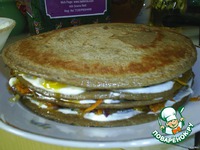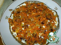 Смазать теплый блинчик майонезом. Выложить морковь с луком. Накрыть следующим блинчиком. |