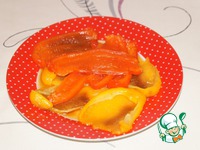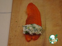 Перец нарезать на полоски шириной 2-2,5 см. Сырно-творожную массу оформить в виде валиков и завернуть в полоски перца. |