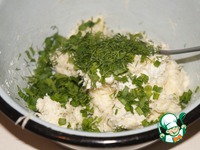 Добавить мелко нарезанного зеленого лука и зелени (укроп, петрушка, кинза). Еще раз вымешать. |