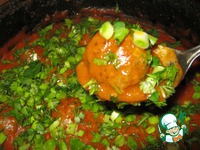 После того, как выложили фрикадельки в соус. Накрываем сковороду крышкой. Огонь убавляем до минимума и оставляем тушиться 25 минут. Готовые фрикадельки посыпаем зеленью. |