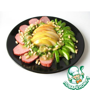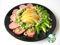 Говядину, грушу и огурец нарезать небольшими ломтиками и выложить на тарелку. С говядиной вполне можно схалтурить и купить готовое мясо в магазине, что, собственно, и было мною в этот раз сделано. |