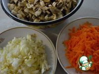 Морковь натереть на средней терке, лук и грибы мелко порезать. |