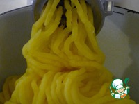 Пропустить отваренный и чуть остуженный картофель через мясорубку с мелкой сеткой. |
