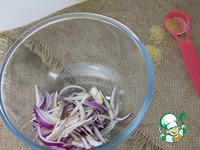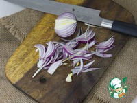 Все предельно просто. Для начала необходимо тонкими полосками нарезать лук. |