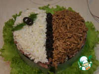 Теперь на одну половину салата выложить обычные белки, на другую - окрашенные, оставив между ними неширокую "траншейку". Маслины мелко нарезать и выложить в виде разделительной полосы. |