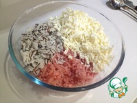 Трём адыгейский сыр. Смешиваем фарш, отваренный рис и тертый адыгейский сыр. Солим, перчим. |