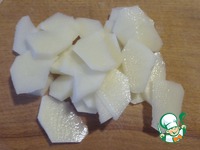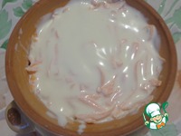 Выкладываем слой картофеля в горшочек, солим по вкусу, покрываем слоем сметаны. |
