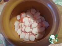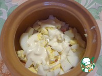 Нарезать кубиками яйцо, выкладываем в горшочек и покрываем сметаной. |