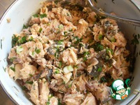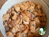 Теперь очередь начинки. Слить из банки сок, горбушу немного размять вилкой, чтобы получились не очень большие кусочки. Примерно, такие. |