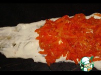 Овощи выкладываем на филе рыбы и сворачиваем его рулетиком. Скалываем зубочистками. |