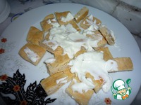 Готовую лепешку разрезать на небольшие куски, разложить по тарелкам, сверху положить пару ложек йогурта. |