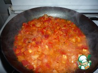 Помидоры (без кожуры) и сладкий перец мелко нарезать, потушить на отдельной сковороде до мягкости минут 8-10, посолить. |
