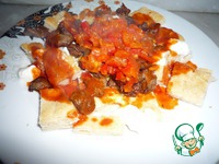 В тарелку поверх лепешки с йогуртом выложить слоями мясо и овощи, полить соусом и подать к столу. |