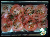 Лист лазаньи, соус, рагу, сыр, лист лазаньи, соус, грибы, сыр, лист лазаньи. Верхний лист смазываем сливочным маслом, кладём нарезанный помидор (мы оставили), присыпаем зеленью (по желанию) |