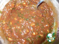 Делаем соус: томатную пасту смешиваем с мелко нарубленными зеленью и чесноком, солим и перчим по вкусу. |