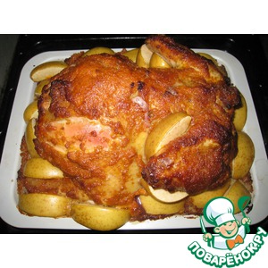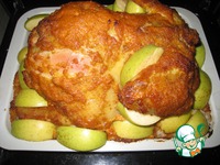После часа приготовления, вынимаем противень и раскладываем вокруг курицы и в подмышки, оставшиеся четвертинки яблок. Ставим обратно в духовку на оставшееся время. |