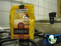 Ко всему добавляем рис, немного обжариваем его. Льем воду, чтобы только покрывало рис. Посолить. Тушим до полуготовности, пусть даже останется немножко водички, дабы в дальнейшем рис не разварился. |