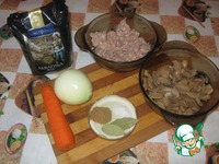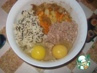 Смешать фарш, обжаренные шампиньоны, морковь, лук, отваренный рис, 2 яйца для связки, добавить соль и приправы по своему вкусу (наличие и количество какой-либо приправы на ваше усмотрение). |