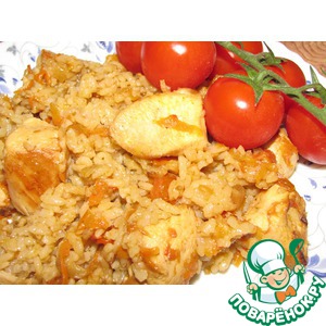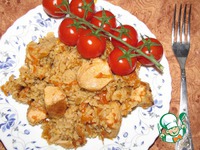 Затем тщательно промыть рис и выложить его на сковороду. Потом залить всё водой (из расчёта: на 1ст. риса 1ст. воды ) убавить на медленный огонь и накрыть крышкой. Оставить томиться 20-25 мин. |