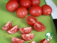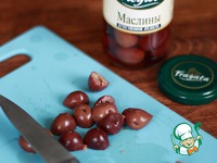 Оливки порезать. У меня были с косточкой. Ее удалить очень просто - придавите оливку плоской стороной ножа, косточка выпрыгнет сама. |