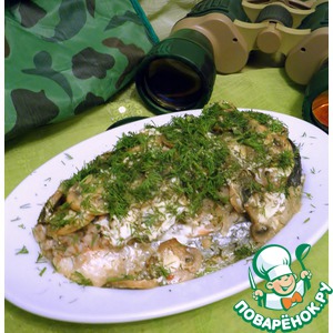 Формируем конверт, хорошо заворачивая края, и ставим его в разогретую до 180 градусов духовку минут на 20-25. Не передержите, иначе рыба будет сухой. |