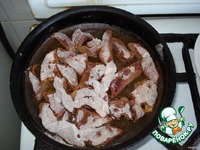 В пакете соединить муку с паприкой и добавить полоски печени. Встряхнуть, чтобы печень обвалялась в панировке. Обжарить в растительном масле и отставить в сторону. |