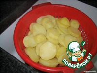 Почистим картофель, и порежем на кусочки толщиной 5-7 мм и отправим в кипящую подсоленную воду, варим, пока картофель не будет готов, выложим в дуршлак, чтобы чуть остыл и ушла лишняя влага |