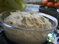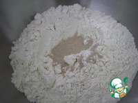 Муку смешать с дрожжами, сделать в муке лунку. В теплой воде растворить соль, масло - 1 ст. л. В лунку из муки добавить воды, замесить мягкое тесто. Муки может понадобится чуть больше. |