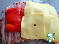 Теперь кусочки перца и сыр. Мясо свернуть рулетом и закрепить, чтобы не распадался. |