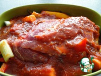 Положить в глубокую форму для запекания. Морковь, лук-порей и сельдерей нарезать на крупные кусочки и положить также в форму. Залить все томатным соусом. |