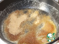 На сковороде со съемной ручкой топим сливочное масло 40г, крутим сковороду, чтоб масло растеклось на стенки, высыпаем 110г коричневого сахара. Ждем, когда начнет карамелизоваться. |