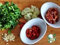 Петрушку, вяленые томаты, сельдерей, бекон, чеснок, чили порезать (можно крупно). Немного посолить начинку, поперчить. |