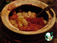 Достаем горошчки или большую форму для запекания. И укладываем ингредиенты слоями: поджарка, болгарский перец, помидорки, фасоль и что осталось: чуть поджарки, помидоров и перца. Можно присолить. |