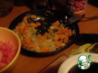 Как только лук стал прозрачным и по кухне пополз потрясный луковый аромат, отправляем морковь к луку, тушим немного, затем добавляем горчицу и тушим до мягкости моркови. Откладываем поджарку. |