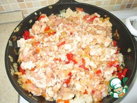 Тем временем готовим начинку. Обжариваем на подсолнечном масле фарш с овощами, порезанными кубиками. Я цветную капусту предварительно отварила 5 мин. Соль, перец или другие специи на ваш вкус. |