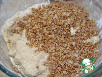 Замесить тесто (оно будет липким), добавить зерна гречки и растительное масло. |