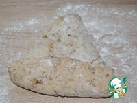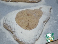 Подошедшее тесто разделить на 2 части. Одну часть расплющить в лепешку и начать формировать грушу. Сначала одну сторону заворачиваем, формируя, как бы, треугольник. |