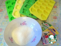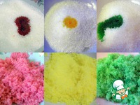 Количество сахара я даю ориентировочно. В среднем, на каждый кусочек сахара у меня уходило 1,5-2 ч. л. сахара, вот на это ориентируйтесь и на то, сколько сахара Вы хотите получить в итоге. В сахар добавляем пару капель красителя. У меня краситель сухой, поэтому я его предварительно растворила в небольшом количестве воды. Обрызгиваем водой - сахар должен стать влажным, но, ни в коем случае, не мокрым, не переборщите. И размешиваем до однородного цвета. При этом добавляем любимые ароматы. У меня сердечки - с корицей, яблочки - с ванилью и миндальные ракушки. |