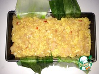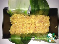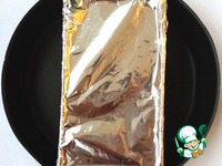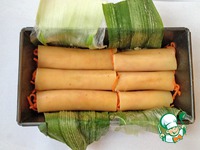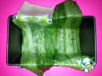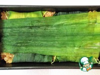 Закрыть свисающими листьями лука-порея. Сверху тоже накрыть целым листом лука-порея. |