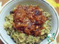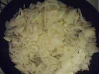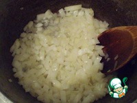 Пока готовится мясо займемся зажаркой для каши. Лук порезать полукольцами. В большую сковородку налить 10 ст. л. масла и обжарить в нем лук на среднем огне по закрытой крышкой 10 мин. |