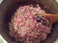 и добавить мясо. Все хорошо обжарить на среднем огне 25 минут, периодически помешивая, и если необходимо, то можно немного добавлить воды, чтобы мясо не пригорело. |