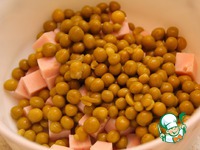 Грейпфрут очистить от белой пленки, порезать дольками. Добавить к ветчине и горошку. |