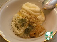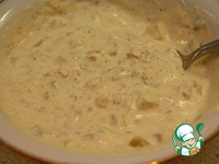Для соуса смешать сметану, майонез и горчицу, посыпать солью, перцем, петрушкой (у меня сушеная), налить белое вино и лимонный сок. |