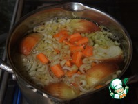 В кипящий бульон опустить картофель, довести до кипения, посолить и варить 5 минут. Затем засыпать болгарский перец и черешковый сельдерей, варить еще 5 минут. |