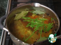 За 10 минут до готовности добавить 2-3 лаврушки, щепотку черного перца горошком, 3-4 душистых перца и 3 гвоздички. |