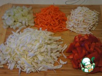 Морковь и корень сельдерея нарезать соломкой, болгарский перец и капусту широкой лапшой, черешки сельдерея - кусочками. |