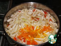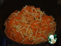 Морковь и корневой сельдерей спассеровать на растительном масле до полуготовности. |