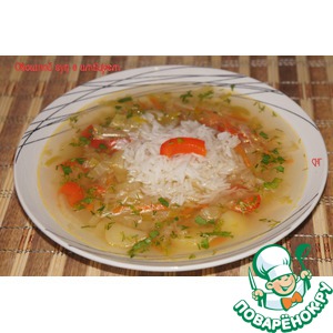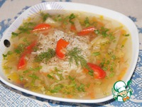 При подаче налить суп в тарелки, гарнировать рисом и посыпать зеленью. |