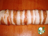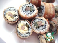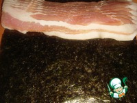 А можно сделать ролл наоборот - после того как выложили рис на нори, перевернуть лист нори на разложенный бекон. также выложить язык, горчицу и соленый огурчик |