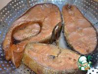 Наша рыбка готова. Вынимаем ее из кастрюльки-вот она какая красивая и сочная... Так как я заложила коптиться немного больше рыбки, чем требуется по рецепту, одну часть мы смело "запробовали" |